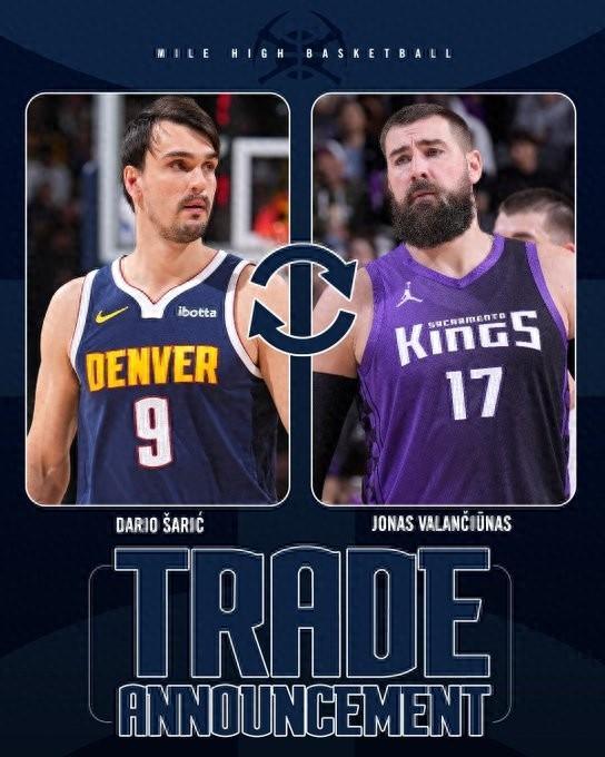北京时间今日,掘金队官方宣布,达里奥-萨里奇和约纳斯-瓦兰丘纳斯的互换交易正式达成。